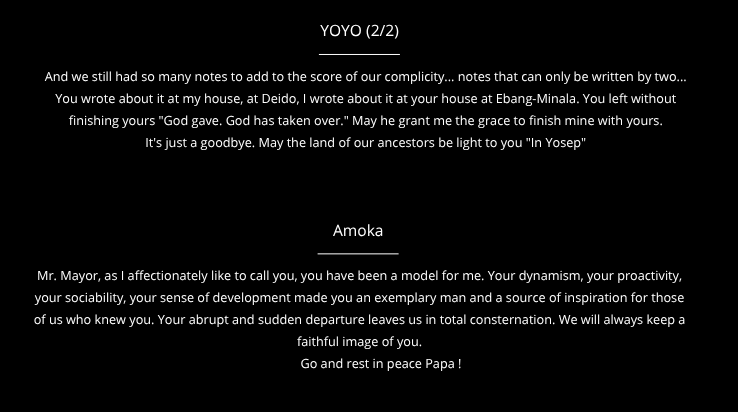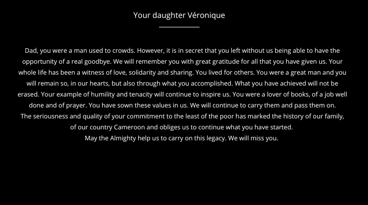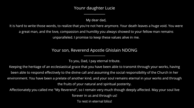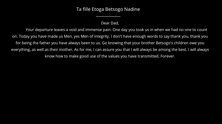 The funeral took place from July 3 to 5, 2025, at the Petit Dan and Sarah Foundation. Family, friends, collaborators, former residents and stakeholders of the orphanage, traditional chiefs and local authorities were present to pay him a final tribute. The events began on Thursday, July 3rd around 10 PM, with a religious choir. Then, the next day was held the lifting of bodies and its installation at the Petit Dan and Sarah Foundation, followed by masses and the funeral vigil. On Saturday, July 5th, the traditional ceremony (Molo awu Essani) took place as well as the testimonies, the mass and finally the burial in strict family privacy. July 5, 2025 was immortalized by professionals, who made a film and photos.