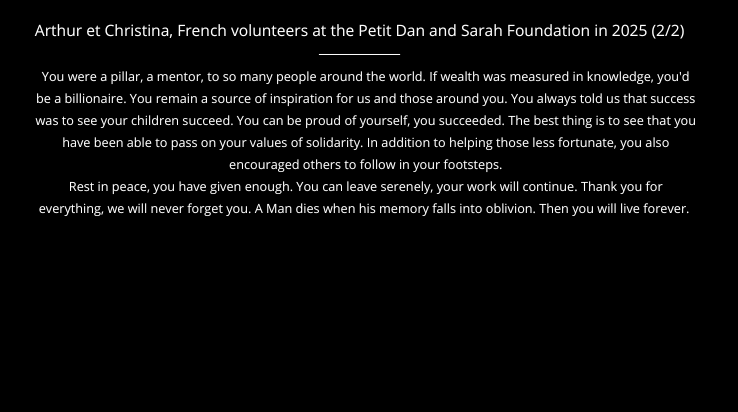 Although his absence leaves an immense void, the action at Petit Dan and Sarah continues. The succession is ensured by the children of the founding couple, still alongside Marie Madeleine ZINGUI. The team remains more than ever committed to living its values and honouring its memory through every action taken for children.