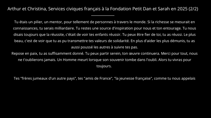 Bien que son absence laisse un vide immense, l’action à Petit Dan et Sarah se poursuit. La relève est assurée par les enfants du couple fondateur, toujours au côté de Marie Madeleine ZINGUI. L’équipe reste plus que jamais engagée à faire vivre ses valeurs et à honorer sa mémoire à travers chaque action menée pour les enfants.