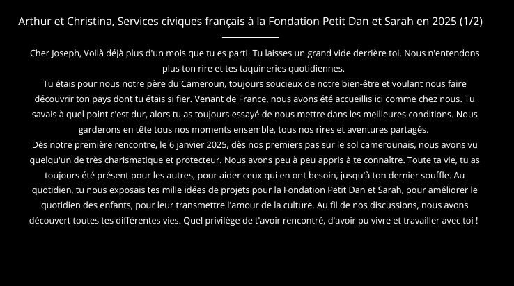 Le 10 juin 2025 des suites de courte maladie, Joseph Désiré nous a quitté. Ses obsèques ont été l’occasion de finaliser et diffuser un documentaire débuté par le fondateur en 2024, présentant l’œuvre de sa vie et témoignant de son engagement aux côtés des enfants orphelins et vulnérables.